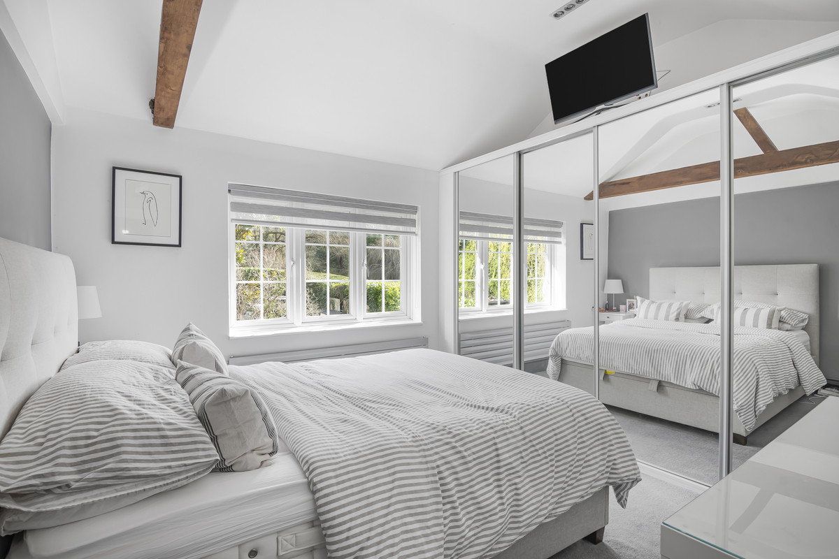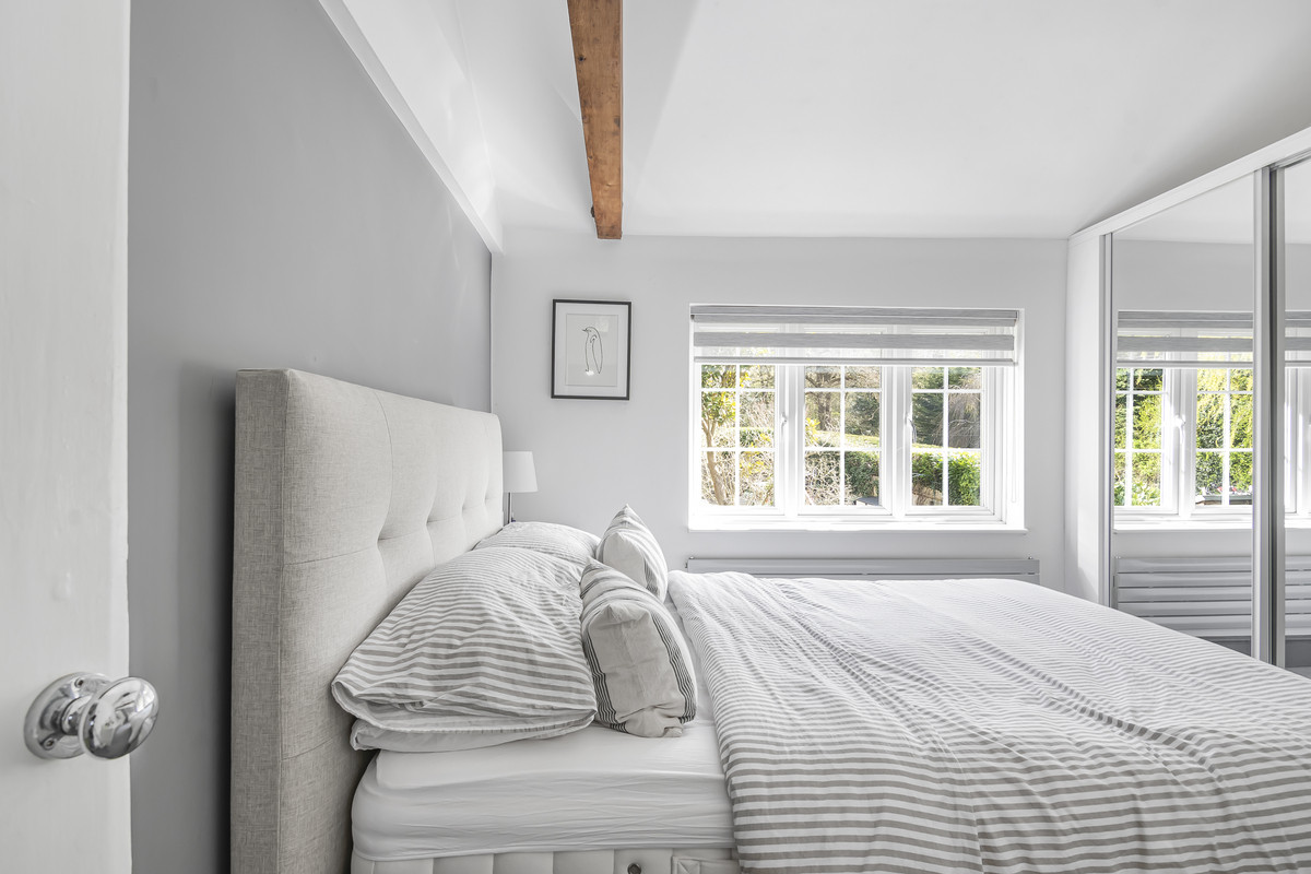 Also located on the ground floor is a modern bathroom, thoughtfully placed and neatly finished with clean, contemporary touches. Upstairs, two well-proportioned bedrooms offer cozy and comfortable living, with one room featuring charming exposed wooden beams that add a rustic yet elegant feel. Both rooms enjoy plenty of natural light and a sense of quiet retreat from the bustle of daily life.