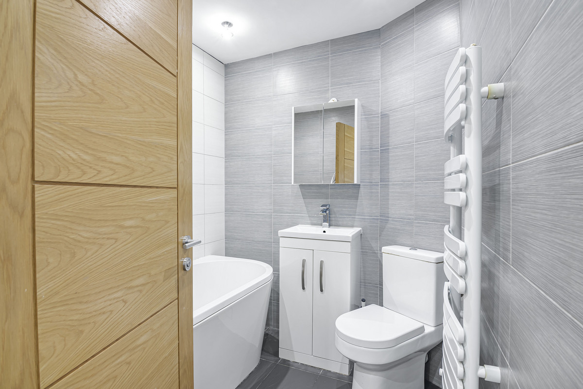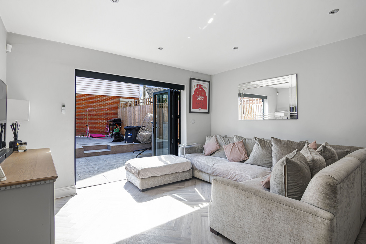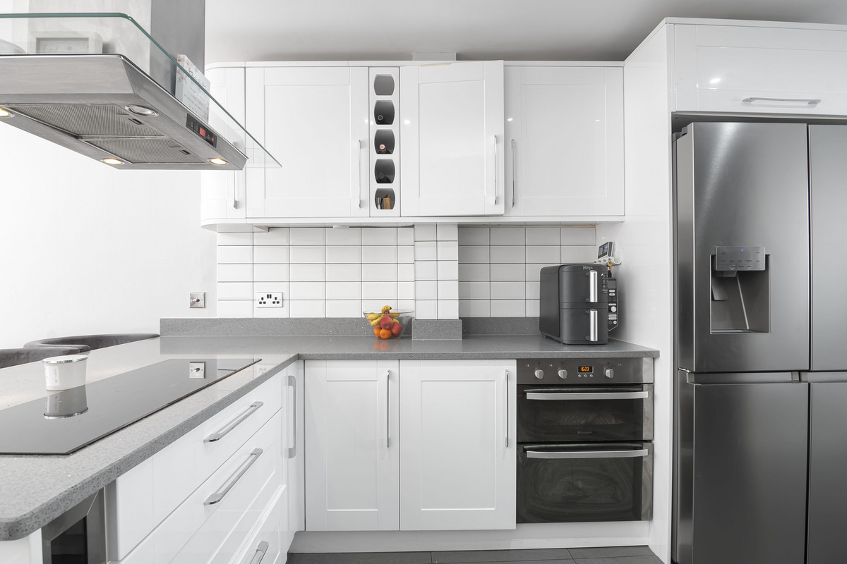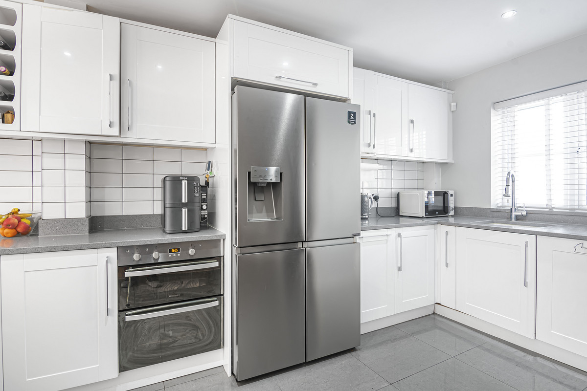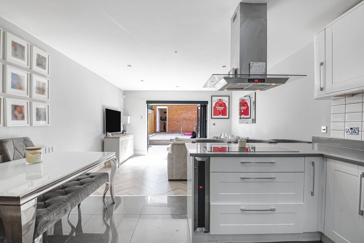 The ground floor boasts a bright and expansive open-plan kitchen and reception area, finished to a high standard with a modern aesthetic. This versatile space is perfect for everyday living and entertaining alike, with plenty of natural light and room to configure the space to suit your lifestyle. The kitchen area is sleek and functional, designed with integrated appliances and generous worktop space to cater to the needs of a modern household.
